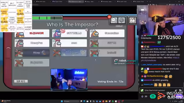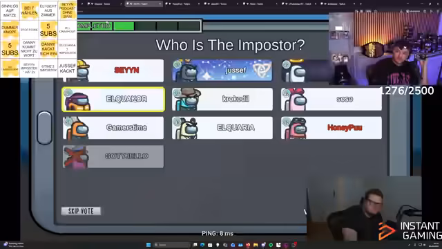 09:10:36Die Spannung steigt, als der Streamer verdächtigt, dass G-Time oder El Quacko der dritte Imposter sein könnte. Er versucht, die Mitspieler davon zu überzeugen, Eli zu voten, und warnt davor, auf ihn hereinzufallen. Die Mitspiiler scheinen verwirrt über die unterschiedlichen Aussagen und Alibis. Nach anhaltenden Diskussionen und Anschuldigungen wird Eli schließlich gevotet, was zu seinem Tod führt und den Rundenverlust der Mitspiiler bedeutet.