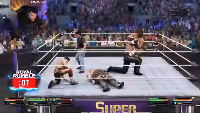 03:36:27Endlich beginnt der Royal Rumble mit den ersten Teilnehmern wie Ziegenmann und mehdi. Es entsteht eine dynamische und chaotische Atmosphäre im Ring. Spieler eliminieren sich gegenseitig und nutzen verschiedene Finisher- moves wie Sweet Chin Music und Piledriver. Die Spannung steigt, während die Teilnehmerzahl reduziert wird.