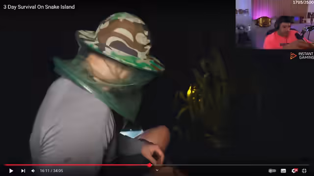 03:55:27Der Streamer schaut sich ein Video über eine Expedition zur 'Schlangeninsel' an, bei der Schlangenschützer Blood Pythons freilassen. Er zeigt sich fasziniert von den Tieren, fürchtet jedoch die immense Gefahr, insbesondere durch große und giftige Schlangen wie die Grüne Anaconda und den Königskobra. Die Demonstration der Wirkung von Schlangengift auf menschliches Blut lässt ihn einen schrecklichen Tod fürchten. Auch die Ankündigung des 'headhunter' durch den Guide Diaz sorgt für große Unruhe und Schock.