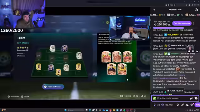 00:08:22Der Stream beginnt mit technischen Vorbereitungen und dem Einbau von Toni Kroos in das Team. Der Streamer erwähnt, dass er aus Versehen ein Aiken-Pack geöffnet hat und sich darüber ärgert, da er stattdessen ein SBC-Pack erwartet hatte. Der Ton des Streams ist leiser, da sich andere Personen im Haushalt befinden. Der Streamer zeigt verschiedene Spieler und versucht, ein Team aufzustellen, wobei er über die Werte und Tauglichkeit der Spieler spricht. Er erwähnt auch den Handel mit Spielern wie Zidane und Konaté auf dem Transfermarkt und macht sich über die Volatilität der Preise lustig.