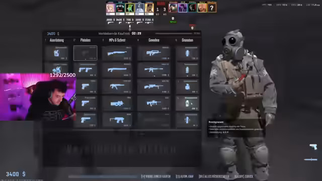 00:42:23Nach der ausführlichen Diskussion der WWE-Vereignisse wechselt der Streamer das Thema zum eigentlichen Anlass, einem CS:GO-Turnier mit einem Preisgeld von 50.000€. Er erwähnt, dass er seine Waffenausrüstung anpassen möchte, da es eine neue Agent gibt. Die Ausrüstung wird so geändert, dass er AOG statt der M4A4 verwendet und P250 sowie Dual Barretts bei den Pistolen. Schwierigkeiten beim Einstellen der Ausrüstung und das Fehlen von Sound beim Start des Spiels werden angesprochen und behoben.