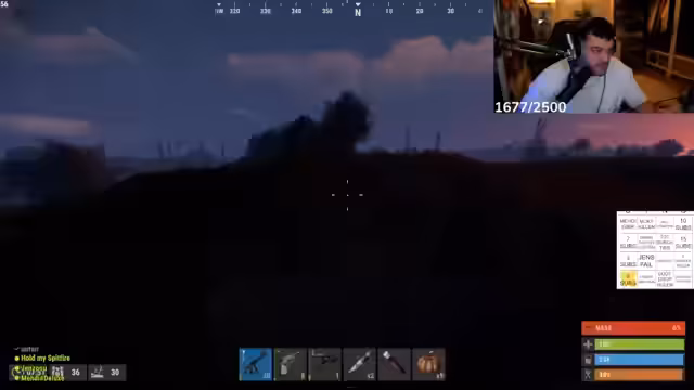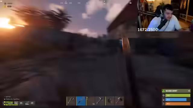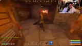 01:42:50Plötzlich erlebt die Base einen feindlichen Angriff durch eine Rakete, die einen Brand im Inneren der Anlage verursacht. In einem hektischen Versuch, die Flammen zu löschen, gelingt es dem Streamer mit wenig Wasser nur teilweise, die Situation zu beherrschen. Der Angriff, bei dem auch sein Charakter zu bluten beginnt, unterbricht die Bauarbeiten und zwingt das Team, sofort auf Verteidigung umzuschalten.