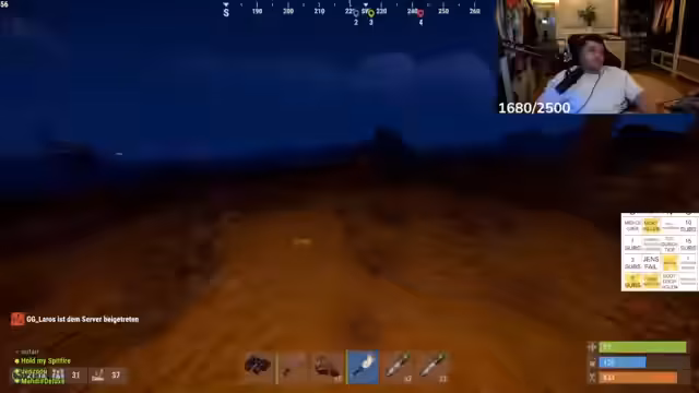 06:18:14Ein mysteriöser, nackter Spieler taucht in der verlassenen alten Base auf und versucht, die Tür mit einer Kettensäge aufzusägen. Obwohl der Streamer alarmiert ist, kann er den Eindringling nicht sofort identifizieren. Die Szene ist unheimlich und stellt eine ungeahnte Bedrohung dar, die den Streamer dazu veranlasst, vorsichtig zu agieren und seine aktuelle Basis zu sichern.