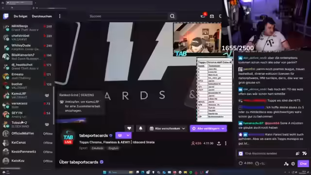 07:30:16Der Fokus liegt auf dem Live-Öffnen von Wrestling-Kartenboxen. Der Streamer zeigt verschiedene seltene Karten, darunter Autogrammkarten wie Batista und John Cena. Es gibt Diskussionen über Seltenheiten wie numbered, Inscription oder One-of-One-Karten, und die Freude über besondere Züge, wie eine Randy Orton-Karte mit Blutspuren, wird im Chat geteilt.