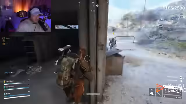 00:56:14Während einer Raid-Szene kommt es zu einem Feuergefecht mit NA-Spielern, das in Chaos endet. Nachdem der Streamer versucht, Freundschaft zu signalisieren ('I'm friendly'), wird er beschossen. Er analysiert die Situation: 'Die haben sich gespittert' und 'Er hat mich so bodenlos weggeschossen'. Die Szene zeigt die Risiken von Cross-Server-Kooperationen, bleibt aber Teil der gemeinsamen Raid-Strategie.