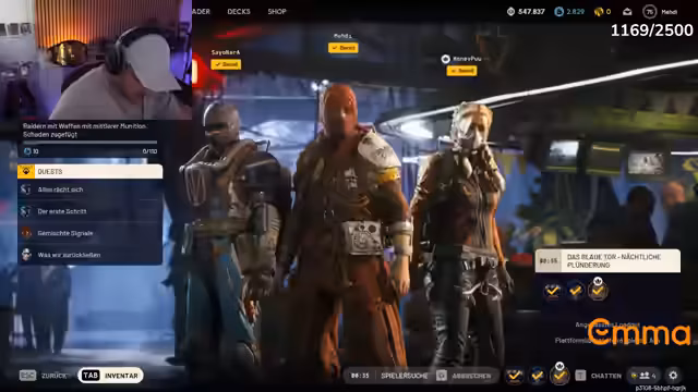 04:20:34Nach einer knappen Extraction feiert das Team das Überleben mit RGB-Katzenohren, die der Streamer personalisieren möchte (pink/LSD-Effekt). Es folgen Spielmodus-Diskussionen: Stella Montes vs. Blue Gate mit elekromagnetischem Sturm. Der Streamer betont den Reiz von nächtlichen Plünderungen und hoher Risiko-Rendite, während er über Erschöpfung und Pausen für WC-Besuche spricht.