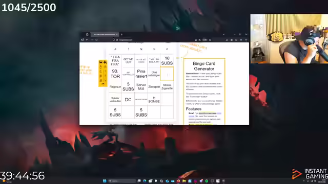 06:09:09Die Zahl 4,44 Euro wird als Engelszahl bezeichnet, die oft positive Ereignisse ankündigt. Es wird überlegt, was man aufladen könnte, und spekuliert, dass jemand bei der Watchparty seinen Monitor zerstören könnte. Die Idee eines Watch-Party-Bingos wird aufgegriffen und schnell umgesetzt. Auf dem Bingo-Feld sollen typische Ereignisse wie Serverprobleme, Danny-Calls, FIFA-Momente, Gegentore in der 90. Minute, Controller-Zerstörung, Ragequits, Zeitspiel von Pina, Disconnects und Chat-Beleidigungen vorkommen. Weitere mögliche Felder sind Bullshit, Wallabilla, die H-Bombe, Anstoß-Bugs und Ecken. Zuschauer werden aufgefordert, auf ihre Tastatur zu schauen. Es wird ein Gewinnspiel angekündigt: Wenn das gesamte Bingo-Feld abgedeckt wird, werden zweimal 25 Euro Instant-Guthaben-Karten verlost. Es wird überlegt, ob alle Teilnehmer heute schon in die Weekend League einsteigen. Vorher soll aber noch eine Runde Rivals gespielt werden.