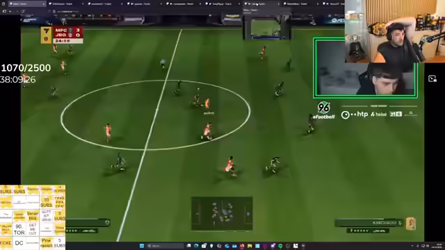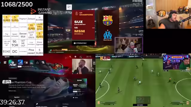 09:03:24Es wird über verschiedene Spiele und Spieler diskutiert. Dabei geht es um knappe Ergebnisse, wie das 4-3 Spiel, und um Spieltaktiken wie Zeitspiel. Es wird über den Einfluss einzelner Spieler, wie Bono, und deren Leistung gesprochen, sowie über unerwartete Spielzüge und Teamzusammenstellungen. Es wird auch über die Qualität des Spiels und Ruckler gesprochen. Es wird über Pazzo diskutiert, der von einer 3-1 Führung zu einem 3-5 Rückstand gerät. Es wird auch über die Schwierigkeit gesprochen, Pausen während des Watch Partys zu machen. Es wird die Popularität von Frauenfußball thematisiert. Es wird über ein Hotel in Berlin gesprochen, das für Prostitution bekannt ist. Es wird über Pazzo diskutiert, der ein 6-6 erzielt und um den Sieg kämpft. Es wird überlegt, ob ein Streamer ausgelastet wäre, wenn Maus nicht vorgelegt hätte. Es wird über Autowin-Listen und deren Korrektheit gesprochen. Es wird die Freude darüber ausgedrückt, wieder im Stream dabei zu sein und Nachholbedarf zu haben. Es wird überlegt, ob Eli mit seinem 80-Millionen-Team erfolgreich sein wird. Es wird Zeitspiel gefordert und überlegt, ob Pazzo besser als Eli ist.