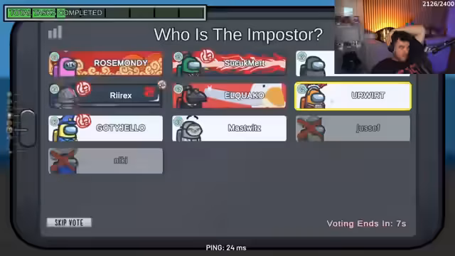 01:46:30Die Runde geht ins Finale, nur noch wenige Spieler sind am Leben. Die Votings werden nun vorsichtiger und strategischer abgehandelt. Der Streamer analysiert die letzten Bewegungen der Überlebenden und versucht, eine logische Schlussfolgerung zu ziehen. Es kommt zu Bluffen und fehlgeschlagenen Manövern, da die Imposter gezielt versuchen, Crewmates zu täuschen.