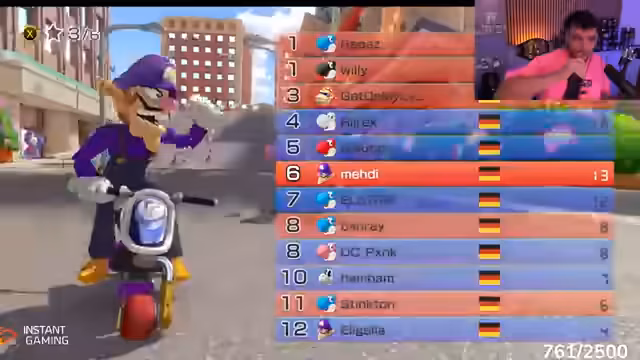 07:26:49Im entscheidenden sechsten Rennen versuchen die Spieler, durch hektische Manöver und Attacken die Führung zu sichern oder zu verteidigen. Es kommt zu Abdrängungsmanövern und verbalen Auseinandersetzungen. Dabei versucht der Streamer, einen Konkurrenten zu blockieren und sieht sein Team in einer hervorragenden Position mit 1, 2 und 3. Der Drang, nicht nachzulassen und bis zum Ende zu kämpfen, ist spürbar.
