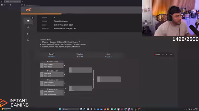 Ein mit Spannung erwartetes Black Ops II Turnier, dotiert mit 8.000€ Preisgeld, wird ausgetragen. Die teilnehmenden Teams, darunter Slump mit Daniel, Philo und Mali, sowie Kaiser und Reapers, bereiten sich auf die Matches vor. Es wird diskutiert, dass jedes Team mindestens einen Spieler ohne Black Ops II Erfahrung hat. Die Turnierorganisation und der pünktliche Start des Cups um 14 Uhr werden hinterfragt, da es noch Erklärungen zu Teams und Regeln gibt, während die Spiele noch nicht begonnen haben.
