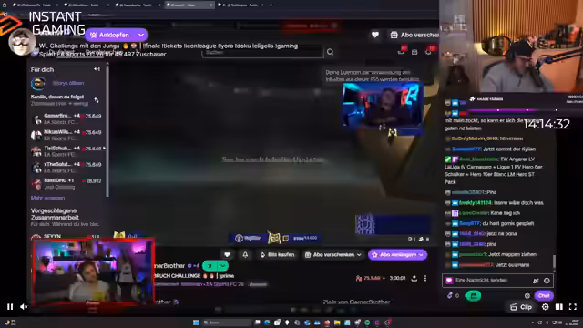 03:01:59Zu Beginn des Stream-Ausschnitts wird intensiv über ein FIFA-Spiel diskutiert. Der Streamer analysiert die Spielzüge und den Spielstil seines Gegners, der nach seiner Aussage nie auf Zeit spielt. Es kommt zu einer hitzigen Debatte über eine taktische Fehlentscheidung, bei der ein Konter verpufft. Der Streamer äußert sich frustriert über die Spielweise des Gegners und empfiehlt, stattdessen auf Zeit zu spielen, was zu einer emotionalen Reaktion im Chat führt.