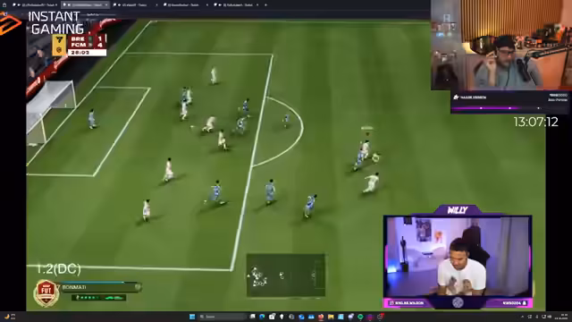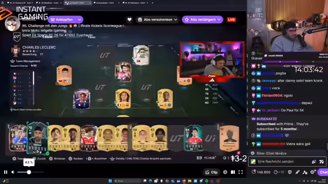 01:42:37Die Teilnehmer berichten von ihren aktuellen Spielen. Willi führt gegen einen Gegner, der einen normalen Spieler statt eines Torhüters im Tor hat und viele Schüsse vergibt. Ein anderer Spieler berichtet von einer hohen Niederlage trotz einer deutlichen Schussstatistik von 40 zu 2. Der Streamer kommentiert unglückliche Spielereignisse, wie Pfosten- und Latenschüsse, und ist frustriert über die als unfair empfundene Spielweise von FIFA. Es wird auch über Messi-Preise an der Börse gesprochen und profit Trades in Erwägung gezogen.