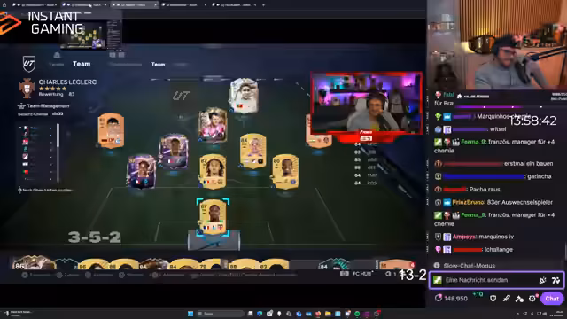 00:53:43Während der Teamfindung werden die Regeln der Challenge angepasst. Insbesondere wird klar, dass die Formation geändert werden muss, falls ein 3-5-2 gedreht wird, auch wenn man ein 4-2-3-1 Team hat. Die anfänglichen Gewinn-Ziele, die per Rad festgelegt wurden, werden neu bewertet. Der Streamer hält seine ursprüngliche Forderung von 12 Wins für unrealistisch und passt sie auf 13 Wins an, da er als Ex-E-Sportler mit dem Level standhalten muss.