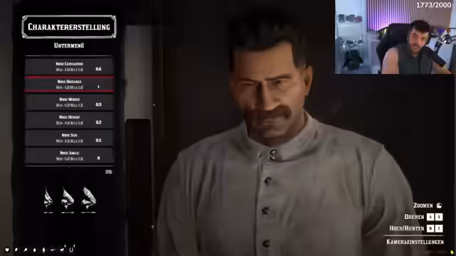 01:53:05Nach erfolgreicher Anmeldung beginnt der Streamer mit der Erstellung seines Charakters. Er diskutiert im Chat über die Aussehensoptionen und entscheidet sich für einen Charakter namens John Crow, der als Pokerspieler, Alkoholiker und Mitglied der 'Four Horsemen' beschrieben wird. Die Erstellung ist aufgrund der komplexen Menüführung und der eingeschränkten Tastatur (60%-Tastatur) eine Herausforderung und kostet viel Zeit. Besonders die Anpassung von Gesichtszügen, Narben und Bart werden ausführlich diskutiert.