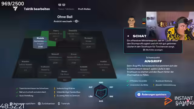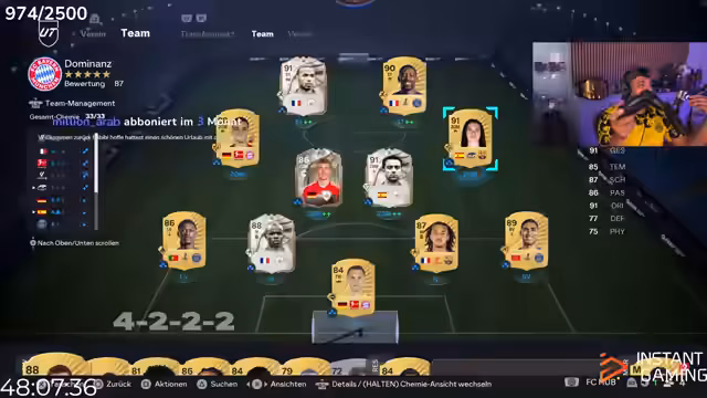 02:52:35Der Streamer plant seine Teamzusammenstellung neu, nachdem er finanzielle Einsätze getätigt und Wetten verloren hat. Er hat etwa 2,2 Millionen Münzen zur Verfügung und überlegt, Beckenbauer zu verkaufen, um Platz und Budget für andere Spieler zu schaffen. Insbesondere interessiert er sich für Xavi als Tiki-Taka-Spieler und Musiala oder Emilio Butragüeno als offensive Verstärkung. Die Entscheidung hängt davon ab, wie sich die Spieler im praktischen Spiel bewähren und ob sie finanziell tragbar sind.
