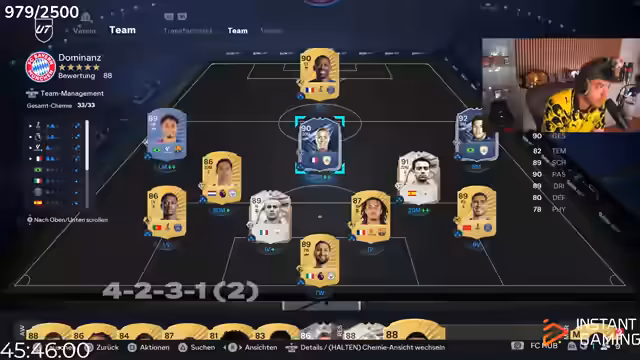 12:31:20Der Streamer diskutiert taktische Aspekte und mögliche Veränderungen in seiner Teamzusammenstellung. Er überlegt, Spieler wie Dembélé und Maradona zu integrieren oder auszutauschen. Er bewertet die Stärken und Schwächen verschiedener Spieler und sucht nach einer optimalen Formation, die zu seinem Spielstil passt.