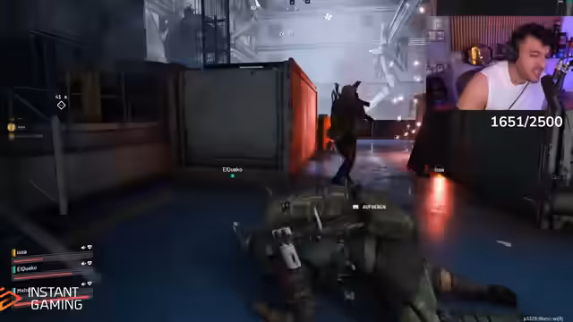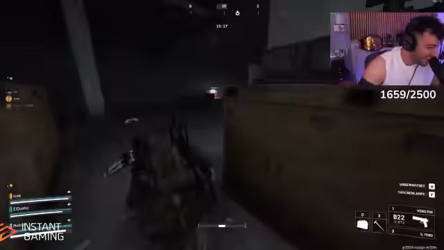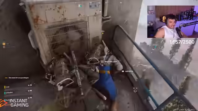 02:03:41In der Schlussphase einer Runde befindet sich das Team in einer prekären Situation. Einer der Spieler wird angeschossen und muss sich kriechend aus dem Kampfgebiet bewegen. Es herrscht große Anspannung, bis der Spieler letztendlich den Extraktortürme erreicht und überlebt, was vom Streamer als 'geisteskrank' und 'ein Männerskurt' bezeichnet wird.