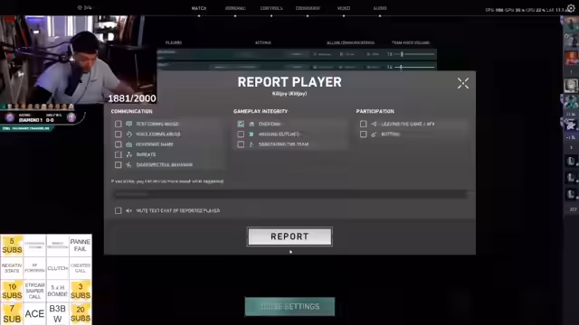 00:30:22Der Streamer diskutiert über den aktuellen Stand des Bings und verweist auf verbleibende Aufgaben wie 'Klatschen', 'Azen', 'negative Stats', 'Cheater-Call', 'Stream-Sniper-Call', 'Panne-Fail', 'Franzosen im Team' und 'Mega-Bauer'. Ein zentraler Punkt ist die Diskussion über verdächtiges Spielverhalten, der Streamer äußert den Verdacht auf Cheating: 'Killjoy cheated.' und 'Wenn das kein Cheater war, hundertprozentig.' Er analysiert eine Situation, in der ein Spieler eine sehr hohe Headshot-Quote von 45-50% hatte und stellt fest, dass 'bei ihr viel zu viele Dinge zu weiß, ohne Infos zu haben' und vermutet einen gekauften Account oder Beta-Tester.