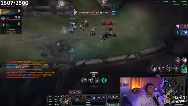 01:08:41Der Stream widmet sich wieder dem aktuellen Gameplay, diesmal in League of Legends. Die Tonalität bleibt intensiv und emotional, mit Sprechchören, strategischen Anweisungen und Frust über gescheiterte Manöver. Der Streamer interagiert stark mit seinem Chat, beantwortet Fragen zu seinem Spielstil und nutzt Begriffe wie 'FF' für 'Forfeit', was einen Abbruch bei hoffnungslosen Spielen signalisiert. Die Atmosphäre ist von Wettbewerb und gemeinsamer Spannung geprägt.