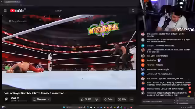 00:38:56Der Streamer wechselt das Thema und spricht über seine Abneigung gegen den Inhalt von League of Legends, den er als 'Content' bezeichnet, da er für ihn keinen Spaß mehr macht. Stattdessen schlägt er vor, stattdessen FIFA zu spielen. Anschließend verlagert sich das Gespräch komplett zur Wrestling-Welt. Er äußert seine große Vorfreude auf den anstehenden Royal Rumble, analysiert vergangene Matches und Wrestler wie Roman Reigns und Finn Bálor, und spekuliert über mögliche Gewinner und Storylines für das diesjährige Event.