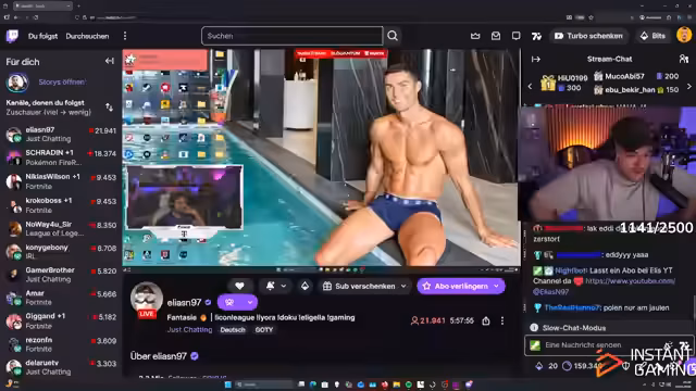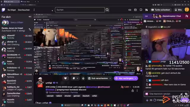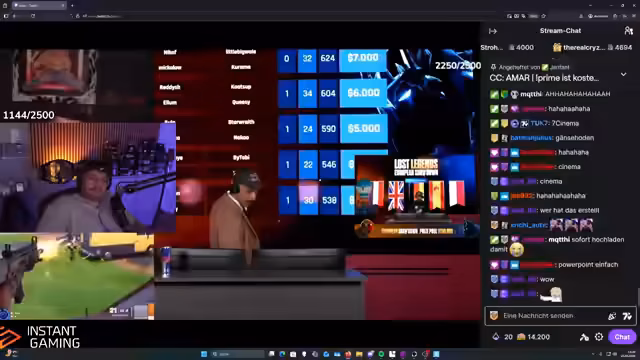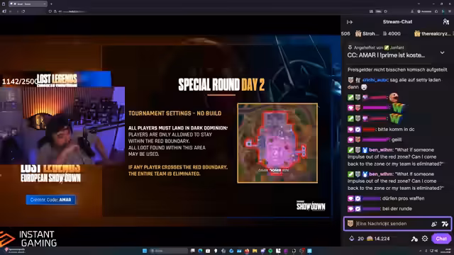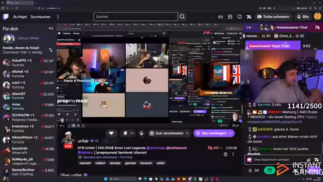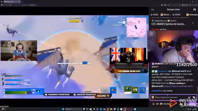 01:30:00Nach der ersten Runde analysiert das Team die Performance mit 9 Kills und Platz 10. Währenddessen kommt es zu einem Online-Konflikt: Der Streamer und andere Teams beschuldigen den führenden Spieler "Isa", unfair zu spielen und im Chat zu "jaulen". Isa kontert im englischen Stream, was zu Spannungen zwischen den internationalen Teilnehmern führt. Der Streamer fordert mehr "Feuer im Kessel" und Konkurrenzdruck für die weiteren Runden.