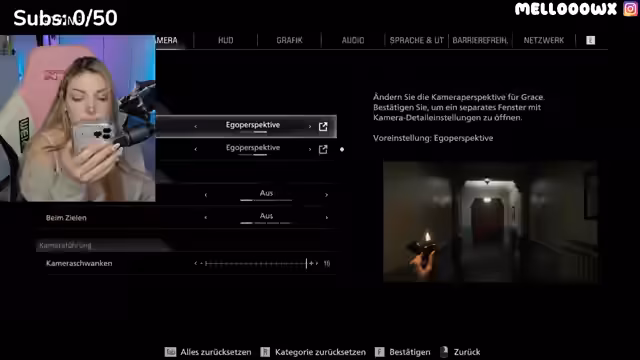 00:16:16Nachdem die Streamerin zunächst das Overlay deaktiviert und ihre Kamera-Position angepasst hat, beginnt sie das Spiel. Die Story beginnt mit der Protagonistin Grace, die in einem Hotel erwacht, das ihr angeblich gehört. Die Atmosphäre ist unheim und gespenstisch. Grace ist offensichtlich besorgt und verunsichert, was durch ihre schüchterne und verängstigte Art verstärkt wird. Die Streamerin fühlt sich unwohl und hat Angst im Hotel.