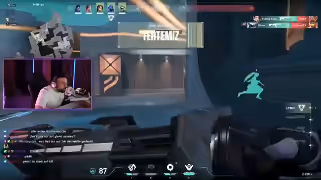 01:13:29Die Spieler bereiten sich auf das Valorant-Match auf der Map Haven vor. Es herrscht Aufregung und Nervosität im Team, aber auch der Wille zu gewinnen. Es wird über die Taktik diskutiert, ob ein Boost möglich ist, um mehr Geld im Spiel zu haben. Die Teammitglieder tauschen sich über ihre Skins aus und korrigieren versehentliche Fehlzuordnungen zu den falschen Teams. Es gibt Verwirrung darüber, wer das Spiel startet und welche Rolle die einzelnen Spieler einnehmen sollen. Die Aufregung steigt, was bei einigen Spielern zu dem Gefühl führt, auf die Toilette zu müssen. Ein Münzwurf entscheidet über die Angriffs- oder Verteidigungsseite, wobei das Team sich für den Angriff entscheidet, da dies auf der Map als vorteilhafter angesehen wird. Nervennahrung und Koffein werden konsumiert, um die Konzentration zu steigern, aber es wird auch vor einem möglichen Zuckercrash gewarnt. Ein Spieler wird ermahnt, seine Negativität zu zügeln, da sie sich auf das Team auswirkt.