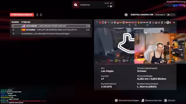 02:14:58Zu Beginn des Streams konzentriert sich der Streamer auf die Einstellungen für den bevorstehenden Las Vegas Street Circuit. Der Fokus liegt auf der Ideallinie und den Fahrhilfen. Nach einer kurzen Diskussion entscheidet sich der Streamer, die Traktionskontrolle für alle Teilnehmer auf Mittel zu setzen. Gleichzeitig äußert er Bedauern über seine angehende Krankheit und den starken Willen, dennoch zu gewinnen, was ihm den Zuspruch des Chat einbringt.
