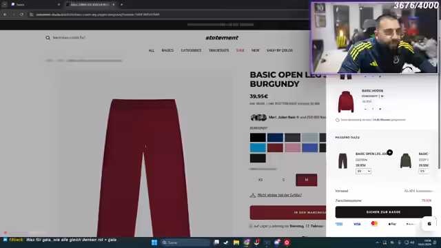 03:35:40Plötzlich bricht der Stream ab, was den Streamer verärgert. Als Grund wird eine „mobile Kamera“ angegeben. Nach einer Unterbrechung startet der Stream neu, und der Streamer präsentiert ein Statement-Produkt, einen Jogginganzug. Er bewirbt die Marke, hebt die Qualität, den Tragekomfort und die deutschen Wurzeln hervor. Er empfiehlt den Trabzon-Fans das Produkt und bietet einen Rabattcode an. Auch ein Fehler im Bestellsystem wird thematisiert, der kurzzeitig zu einem extremen Preis von 66 Euro führt.