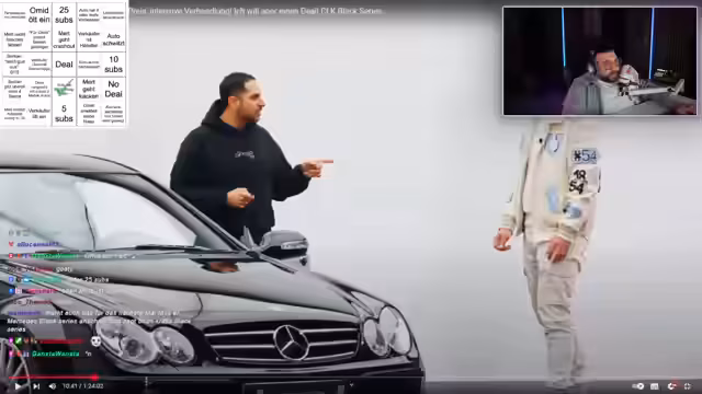 03:10:28Der Streamer beginnt mit der Besprechung eines CLK 63 AMG Black Series, den er bei Omid kauft begutachtet. Er gibt zu, keine Vorkenntnisse über das Auto zu haben und sich auf die Expertise von Omid zu verlassen. Sinan, der Besitzer, erklärt, dass das Fahrzeug 55.000 Kilometer gelaufen ist, aus erster Hand stammt und eine Steinschlagschutzfolie hatte, die vor dem Dreh entfernt wurde. Das Auto wurde poliert und Keramik versiegelt und verfügt über Performance-Sitze und einen Differenzialölkühler. Sinan nennt eine Preisvorstellung von 145.000 Euro. Der Streamer äußert seine Verwunderung über den hohen Preis, da er das Auto optisch niedriger eingeschätzt hätte. Omid erwähnt, dass seine Redaktion ihm Überraschungen bezüglich des Autos angekündigt hat.