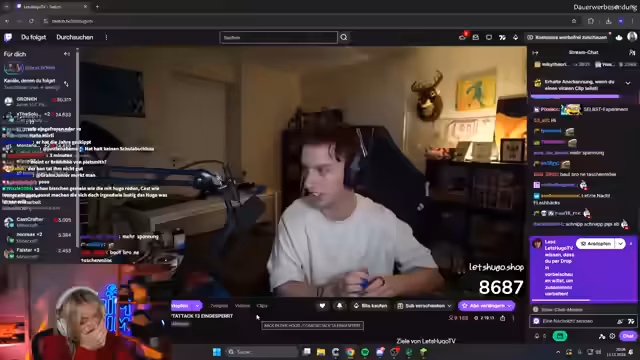 03:32:28Nach einer seltsamen philosophischen Diskussion über Sandkörner und eine Nervenoperation führt Hugo ein Physikexperiment durch und will eine Hand anbrennen lassen. Dies sorgt im Chat für große Aufregung und wird als "Hugo-Stunt-Show" angekündigt. Zuvor hat er bereits mit einem Luftballon und einem Toilettenpapier-Rohr einen selbstgebauten Lautsprecher demonstriert und dabei das Prinzip von Membranen und Magneten erklärt.
