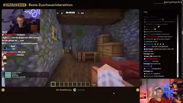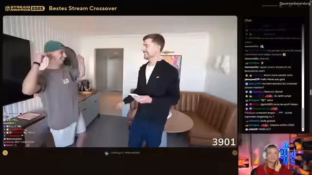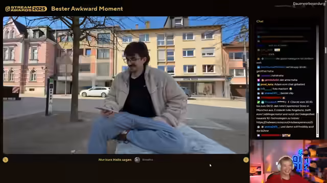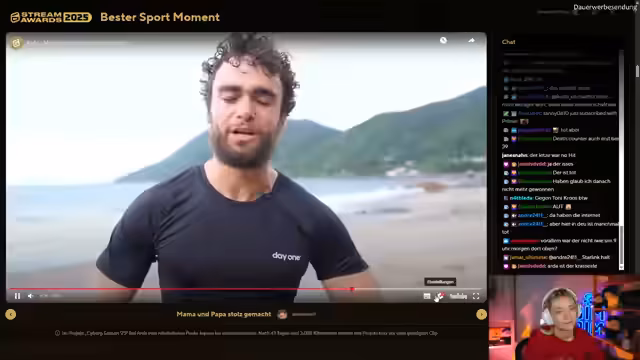 05:15:56Die Kategorie 'Beste Zuschauerinteraktion' wird mit einem humorvollen Beispiel eines 'McFlant Burger'-Codes eröffnet, der zu einem Burger führt, der nur aus Zwiebeln und Tomaten besteht. Ein weiterer Clip zeigt eine gelungene Verarsche eines 14-Jährigen. Ein besonders epischer Moment ist die Rettung eines Handys, das in einen Steg gefallen ist. Ein Zuschauer taucht ohne Zögern ins Wasser, um das Handy zu bergen, was als 'Blindfishing unter Wasser' und 'goated Zuschauer' gefeiert wird. Diese Aktion wird als 'ultra korrekt' und 'super genial' gelobt, da sie die Hilfsbereitschaft und den Gemeinschaftssinn der Zuschauer hervorhebt. Die Interaktionen reichen von lustigen Momenten bis hin zu beeindruckenden Taten, die die Verbundenheit der Community zeigen.