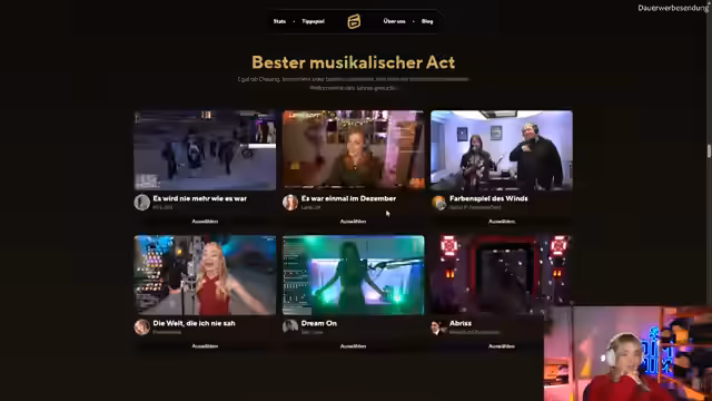 05:24:32Die Bewertung der musikalischen Acts beginnt mit einer Diskussion über die 'guitar-FB-Situation' und die Notwendigkeit von Auto-Tune für einen Sing-Stream. Es wird festgestellt, dass die persönliche Verbindung zu einem Song entscheidend für die Wirkung ist; wer den Track nicht kennt, wird weniger emotional berührt, auch wenn die Gesangsleistung gut ist. Mehrere Balladen werden vorgestellt, doch der Streamer kann wenig damit anfangen, da ihm die persönliche Verbindung zu diesen Liedern fehlt. Ein Clip von 'Kevin und die Pommes Forks' wird vermisst und zur Nominierung vorgeschlagen, da dieser Act als potenziell stark angesehen wird. Schließlich wird ein Clip von IFA als Gewinner in der Kategorie des besten musikalischen Acts gekürt, da dieser Song dem Streamer bekannt ist und sofort Gänsehaut verursacht, was die Bedeutung der persönlichen Relevanz für die Bewertung unterstreicht. Die Lichtshow wird als 'stressig' empfunden.