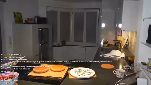 03:01:25Nach dem Herausnehmen der Torte aus dem Kühlschrank wird das Gelee festgestellt. Die Streamerin schneidet die Biskuitböden auf die richtige Höhe und setzt sie als dreistöckige Torte zusammen. Sie bemerkt, dass die Masse zu viel ist und überlegt, aus dem Überschuss Cake Pops oder einen Kuchen-Roll zu machen. Sie entschließt sich, einen Kuchen-Roll zu formieren und diesen als finale Dekoration auf der Torte zu platzieren. Zum Schluss stellt sie die Torte noch einmal in den Kühlschrank, um sie für den Geburtstag des Vaters am nächsten Tag fertig zu machen, und kündigt an, das Ergebnis in ihrer Instagram-Story zu zeigen.