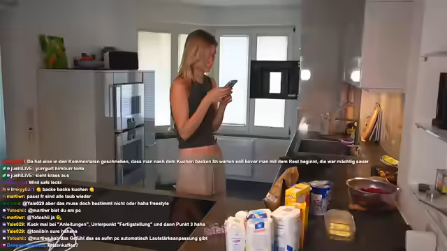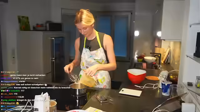 00:11:52Nachdem die technischen Schwierigkeiten behoben sind, stellt die Streamerin das heutige Backvorhaben vor: eine Himbeertorte. Sie hat das Rezept auf ihrem Handy bei 'Naschglück' gefunden, es aber noch nicht im Detail studiert. Es folgt die kurze, aber komplexe Bestandsaufnahme der vorhandenen Zutaten. Sie hat zwar alle Zutaten für den Biskuitboden, jedoch sechs statt der benötigten vier Eier. Für die Himbeeren zeigt sich, dass sie mehr gekauft hat als das Rezept verlangt. Sie beginnt mit der Vorbereitung der Biskuitmasse, wobei sie sich an ein alternatives Rezept aus dem Chat anlehnt und die Zutaten aufgrund der falschen Eieranzahl anpasst.