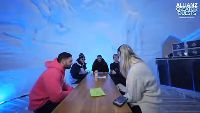 10:17:43Die fertigen Schneeschuhe werden übergeben. Das Team erhält 9 Coins und erfährt, dass das nächste Spiel Jenga ist. Der Gewinner erhält das Luxus-Iglo (gegen Basic-Iglo). Merle und Berl äußern Respekt vor der Aufgabe ('5% Erfolgschance'), da sie Schwächen in feinmotorischen Spielen haben. Sie bereiten sich mental vor ('Cool down your mind. Konzentration.') und planen, die Gondelbahn-Frage zur Ermittlung des Startspielers zu nutzen.