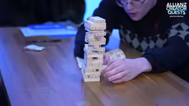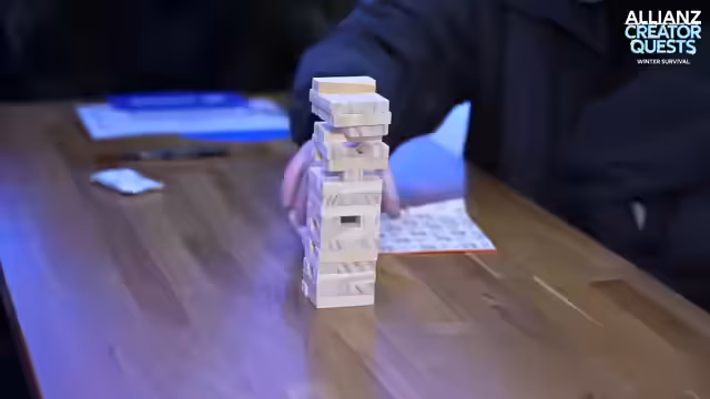 10:43:49Die Spieler arbeiten eng zusammen, um den Jenga-Turm zu stabilisieren und erfolgversprechende Blöcke zu identifizieren. Sie tauschen strategische Ratschläge aus, wie das Verschieben von Blöcken in bestimmte Richtungen, um die Balance des Turms zu erhalten. Die Kälte erschwert dabei die präzise Handhabung, dennoch bleibt das Team motiviert und konzentriert auf das gemeinsame Ziel.