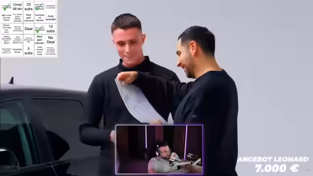 00:25:53Omid setzt die Begutachtung von Leonards Audi A3 fort und entdeckt eine Schweizer Vignette, die darauf hindeutet, dass das Auto im letzten Jahr in der Schweiz war. Er stellt fest, dass der Wagen aus fünfter Hand ist und bittet Leonard, den Fahrzeugbrief zu zeigen. Omid bemerkt, dass die Parfüms in der Tür fast mehr wert sind als das Auto. Er stellt fest, dass das Auto nachlackiert wurde und mehr als drei Vorbesitzer hatte. Durch den Fahrzeugbrief stellt Omid fest, dass es sich tatsächlich um die fünfte Hand handelt. Er analysiert die Historie des Fahrzeugs und stellt fest, dass es in der Vergangenheit zwei Besitzer mit gleichem Nachnamen und Adresse gab, vermutlich Geschwister. Das Auto war zuvor in Berlin und Mannheim zugelassen. Omid entdeckt den Kaufvertrag im Auto und nimmt ihn unverschämt an sich, um ihn einzusehen. Er stellt fest, dass das Panoramadach vorhanden ist, was die Bewertung des Wagens weiter beeinflusst. Er darf in den Kofferraum schauen und fragt nach dem Serviceheft. Omid findet die Historie des Wagens trotz der vielen Vorbesitzer akzeptabel, da es sich hauptsächlich um Privatpersonen handelte.