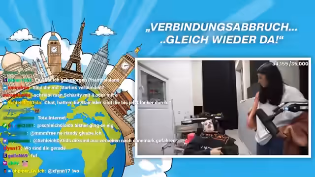 00:01:56Die Reise von Anfang an von technischen und organisatorischen Herausforderungen geprägt. Die Lautstärke im Fahrzeug wird als zu hoch empfunden, weshälb die Fenster geöffnet werden müssen, was die Chat-Community mit den Worten 'wir sind gefickt' kommentiert. Kritisch wird auch die mobile Technik betrachtet; der Stream droht ständig zu unterbrechen, insbesondere bei der Durchfahrt von Tunneln oder unter Satellitendächern. Es wird oft auf den Starlink-Service als wichtige Backup-Lösung Bezug genommen und es gibt ständige Probleme mit der Akkulaufzeit der Kamera und der externen Ladehilfen, die eine fortwährende Suche nach Lösungen erforderlich machen.