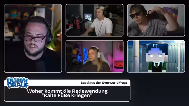 01:36:19Die Lösung wird gefunden: Ein Blockversager ist jemand, der im ersten juristischen Staatsexamen in einem der schriftlichen oder mündlichen Prüfungsblöcke versagt und daher nicht an der mündlichen Prüfung teilnehmen darf. Die Teilnehmer zeigen sich zufrieden, die Lösung gemeinsam hergeleitet zu haben. Anschließend wird die Frage aufgeworfen, woher die Redewendung 'kalte Füße kriegen' kommt. Zunächst werden verschiedene Erklärungen vorgeschlagen, wie eine Expedition in der Mammutzeit, Bergsteigen oder eine Mutprobe im Schnee. Es wird festgestellt, dass es um einen Ort geht, an dem es kalt ist, aber nicht unbedingt um Schnee oder Wasser. Es wird die Idee eingebracht, dass man vor die Haustür geht, um die Temperatur zu messen, oder dass man an der Kante eines Helikopters sitzt und kalte Füße bekommt. Schließlich wird der Fokus auf einen Keller gelenkt, wo es tendenziell kälter ist.