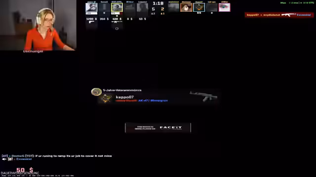 03:29:12Das Stream-Schwerpunkt verlagert sich vollständig auf die Konkurrenz im Counter-Strike. Der Streamer, der sich selbst als 'not-reale Gamerin' bezeichnet, kämpft mit der Performance und der Konzentration in den Runden. Er interagiert stark mit seinem Chat, beantwortet Fragen und bittet um Unterstützung, was zu einer hochgradig interaktiven Atmosphäre führt, in der er sowohl Erfolge als auch Rückschläge teilt.
