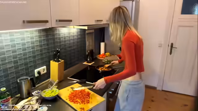 01:14:19Die Süßkartoffeln werden halbiert, mit Öl, Salz und Pfeffer gewürzt und zum Backen in den Ofen geschoben. Parallel dazu werden die restlichen Zutaten für das Gericht vorbereitet: Kidneybohnen und Mais abgegossen, Chili klein geschnitten und der Knoblauch gepresst. Für die Guacamole werden zwei Avocados entkernt und grob zerdrückt. Die Streamerin macht dabei Andeutungen über ihren mäßigen Umgang mit scharfen Chilis und ungewöhnliche Kochgewohnheiten, wie das direkte Essen aus der Dose.