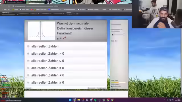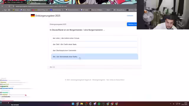 03:32:45Nach mehreren gescheiterten Mathe-Versuchen schlägt der Streamer einen Fachwechsel vor, um eine neue Herausforderung zu starten. Er entscheidet sich, einen Einbürgerungstest für Deutschland zu machen. Er diskutiert verschiedene Bundesländer und entscheidet sich schließlich für Nordrhein-Westfalen. Der Streamer zeigt große Anspannung und Konzentration während des Tests, der aus 33 Fragen besteht.