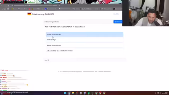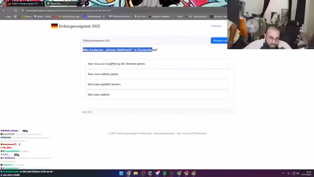 04:06:45Der Streamer setzt seinen Einbürgerungstest fort und beantwortet weitere Fragen zu deutschen Gesetzen, Bräuchen und Politik. Er zeigt Unsicherheit bei manchen Fragen, wie dem Namen der Hauptstadt von NRW, und ratet manchmal. Er diskutiert auch Grundrechte in Deutschland und erklärt seine Sichtweise auf Meinungsfreiheit und andere demokratische Prinzipien. Er betont die Wichtigkeit von Wissen und Bildung.