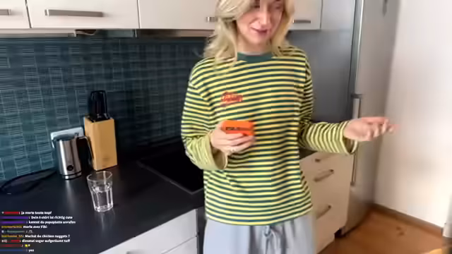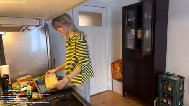 00:02:36Nach der Begrüßung wird der Plan für den Stream vorgestellt. Es ist ein gemeinsamer Koch-Stream geplant, um verbleibende Lebensmittel aus dem Kühlschrank zu verwerten, da die Streamerin zu einem Geburtstag nach Köln fahren muss. Dazu werden erste Vorbereitungen getroffen, wie das Aufstellen der Kameras und die Überprüfung der Geräuschkulisse aus dem Haushalt, wie piepende Waschmaschine und Eierkocher.