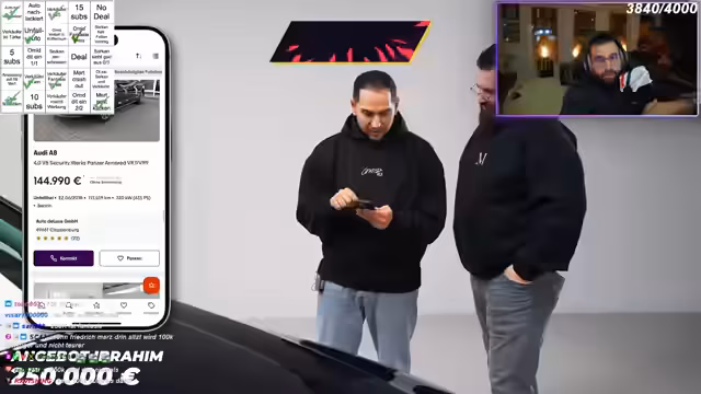 00:08:35Der Stream wird von einem Besuch bei einem Autohändler begleitet, bei dem ein roter, gepanzerter Audi A8 L vorgestellt wird. Der Streamer zeigt sich beeindruckt von der Seltenheit des Fahrzeugs und dessen Ausstattung. Der Verkäufer, Omid, erzählt von der Geschichte des Wagens und behauptet, dass dieser einst von der ehemaligen Bundeskanzlerin Angela Merkel genutzt wurde. Die anfängliche Begeisterung des Streamers wechselt jedoch schnell in Skepsis, als der hohe Preis von 250.000 Euro genannt wird.