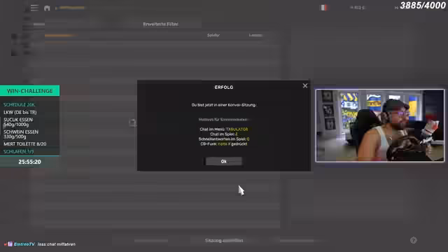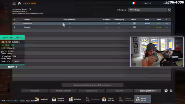 03:47:41Der Stream startet mit dem Versuch, eine gemeinsame Spiellobby für das Truck Simulator-Spiel zu erstellen. Die Streamer müssen auf die Mods der anderen achten, die sie sich herunterladen und abonnieren müssen, um an der Challenge teilzunehmen. Es kommt zu erheblichen technischen Problemen bei der Lobby-Erstellung, da die Passworteingabe fehlerhaft ist und die Session-ID nicht funktioniert. Es müssen Einstellungen angepasst und Lobbies mehrmals neu erstellt werden, bis alle Teilnehmer endlich Zugang finden.