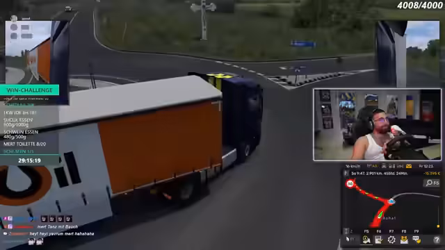 08:34:28Nach über sieben Stunden und massiven technischen sowie emotionalen Problemen gibt einer der Teilnehmer den LKW Simulator auf. Der Streamer fühlt sich von der Challenge betrogen, da die prognostizierte Fahrzeit von einer Stunde komplett ignoriert wurde. Das Erreichen der Türkei wird mit einem müden 'Fertig Chat, fertig' kommentiert. Der Frust über das Spiel und die damit verbundene Anstrengung ist so groß, dass der Streamer damit droht, das Spiel zu deinstallieren, und sich von der Gruppe distanziert.
