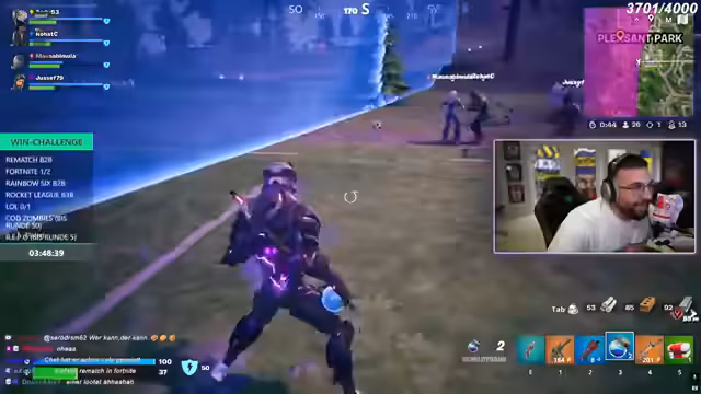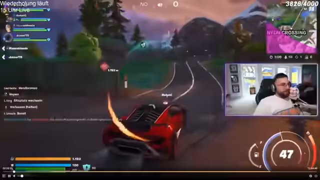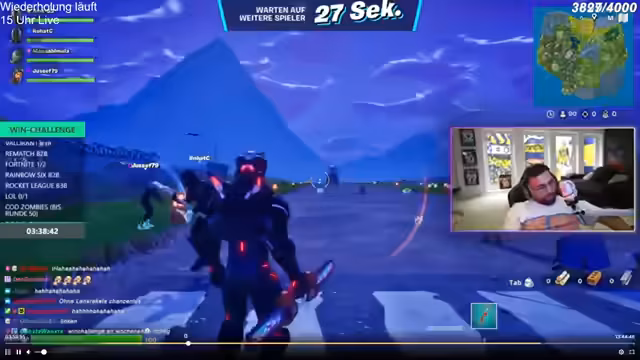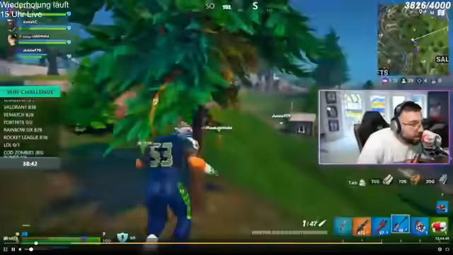 13:57:02Der Streamer wechselt endgültig zu Fortnite, nachdem er über die Spieleauswahl diskutiert hat. Das Team kämpft in einer Lobby mit Performance-Problemen und sucht nach einer stabilen Verbindung. Es kommt zu chaotischen und stressigen Kämpfen, strategischen Entscheidungen und dem Versuch, die Zone zu halten, während das Team aufeinander abgestimmt agieren muss.
